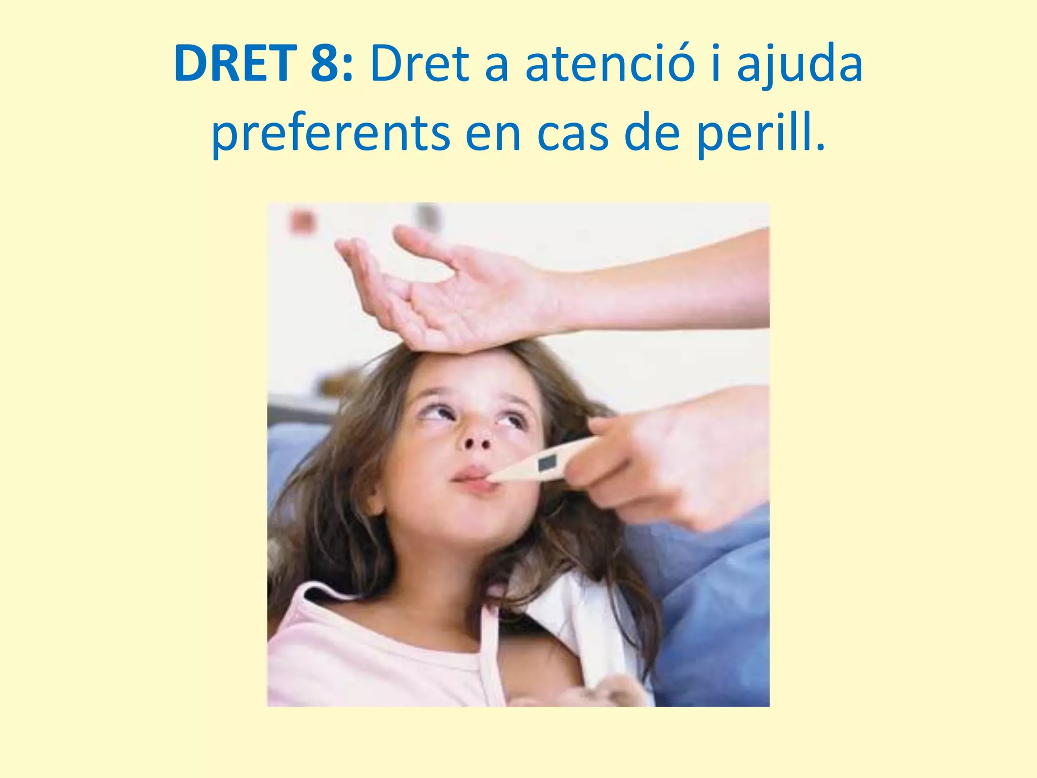 8. Dret a rebre atenció i ajuda preferents en cas de perill: El deure és conèixer les persones i les institucions a qui dirigir-se i per això cal que els adults que els acompanyem en el procés de creixement els oferim l’ajuda necessària per a arribar a les persones i institucions que, realment, els poden ajudar. Cal saber oferir ajuda a les persones que viuen en una situació més vulnerable.