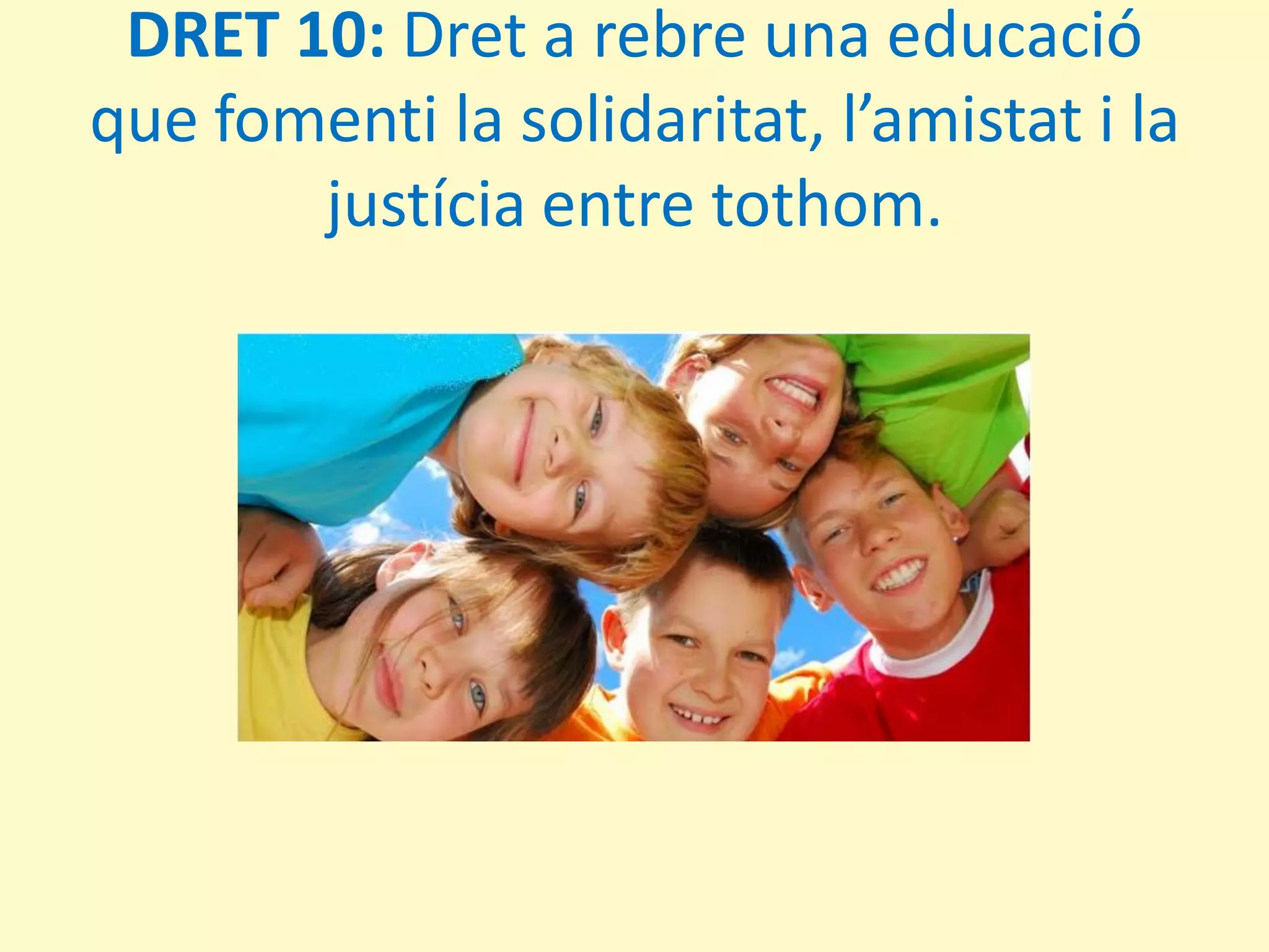 - Dret a rebre una educació que fomenti la solidaritat, l'amistat i la justícia entre tothom.