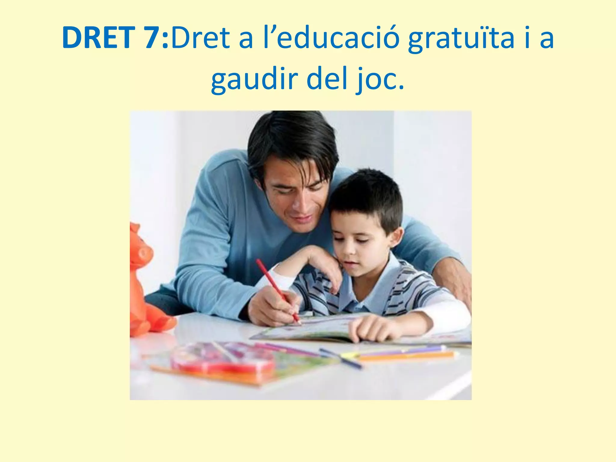 - Dret a l'educació gratuïta. Dret a divertir-se i a jugar.