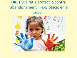 9. Dret a la protecció contra l’abandonament i l’explotació en el treball: El deure dels infants és ser infants i gaudir d’aquesta etapa de la vida. És un deure dels adults no permetre ni l’abandonament ni l’explotació en el treball. Els infants han de jugar, anar a l’escola i, per sobre de tot, ser estimats i els responsables que això sigui així som els adults. Els infants tenen el deure de no deixar de banda a ningú ni fer-lo sentir malament.