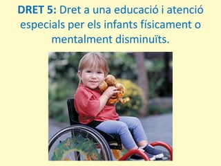 5. Dret a una educació i atenció especial per als infants amb diversitat funcional: Totes les persones som diferents i per això necessitem una educació adaptada a les nostres característiques. El deure dels infants i joves és aprofitar aquest dret respectant les diferents característiques dels companys i les companyes del grup perquè és una oportunitat per a aprendre i créixer com a persona. Cal treballar per a què tothom trobi el seu lloc en la societat.